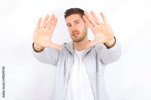 Portrait of smiling young caucasian man wearing casual clothes over white background looking at camera and gesturing finger frame. Creativity and photography concept.
