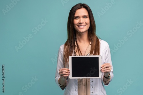 Portrait of smiling young doctor in white coat showing the screen of digital tablet in her hand.