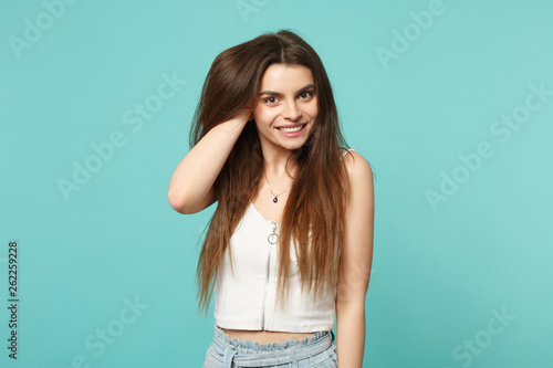 Portrait of smiling young woman in light casual clothes looking camera, putting hand on head isolated on blue turquoise wall background. People sincere emotions, lifestyle concept. Mock up copy space.