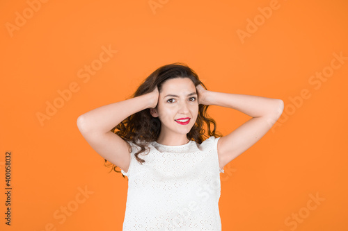 Portrait of smiling young woman standing with hands in hair against orange background. Caucasian girl with red lips looking at camera
