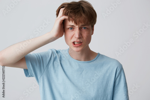 Portrait of stressed displeased young man with braces on teeth wears blue t shirt keeps hand on head and suffering from headache isolated over white background