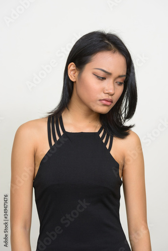Portrait of stressed young Asian businesswoman thinking and looking down