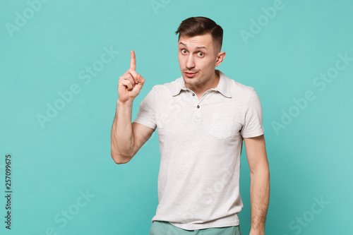 Portrait of strict young man in casual clothes pointing index finger up, preaching isolated on blue turquoise wall background in studio. People sincere emotions, lifestyle concept. Mock up copy space.