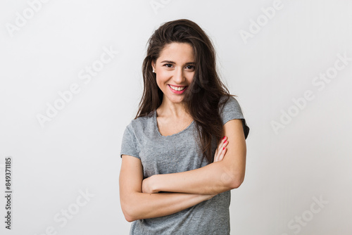 portrait of stylish young pretty woman smiling in grey t-shirt on white studio background, isolated, natural look, long brown hair, crossed arms