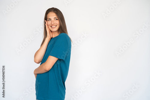 Portrait of surprised woman holding her face with hand. Female Caucasian model with brown hair and grey eyes in turquoise T-shirt and casual jeans standing aside looking amazed. Advertising concept