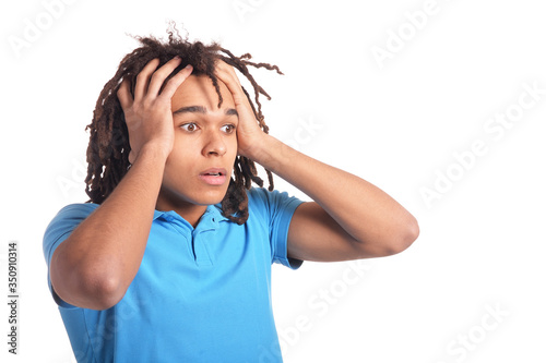 Portrait of surprised young man posing against white background