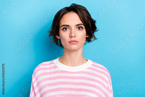 Portrait of sweet serious business lady secretary wearing pink pullover isolated on blue color background