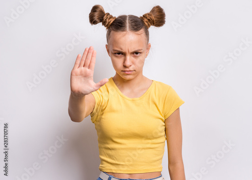 Portrait of teen girl doing stop sing with palm of hand, on gray background. Beautiful caucasian teenager making stop gesture with negative and serious facial expression. Angry child looking at camera