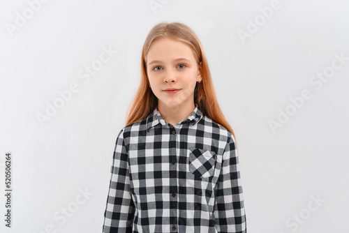 Portrait of teen girl with fair-haired looking at camera, standing in casual shirt. Indoor studio shot on white background