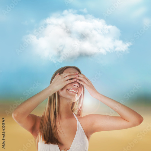 Portrait of the beautiful girl on the beach hiding her eyes with