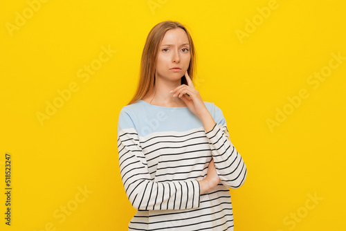 Portrait of thoughtful female, keeps finger on cheek, contemplates about future wedding with boyfriend or making important decision, dressed in casual striped sweatshirt, yellow background