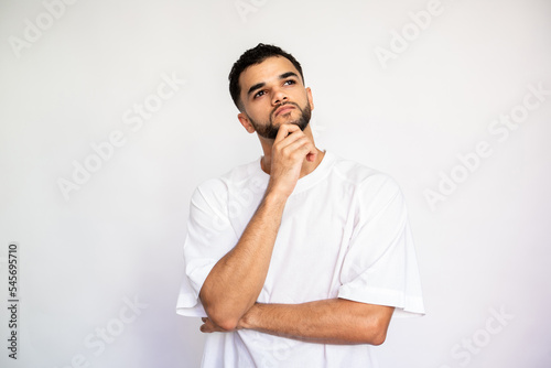 Portrait of thoughtful young man leaning on hand. Pensive Caucasian male model with dark hair and beard in white T-shirt looking away, thinking while touching chin. Focus, contemplation concept