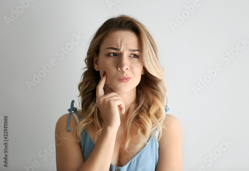 Portrait of thoughtful young woman on light background