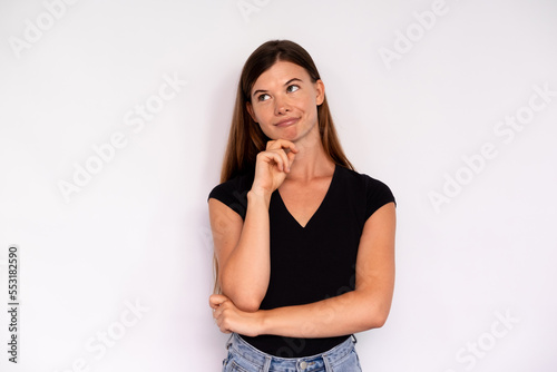 Portrait of thoughtful young woman posing with hand on chin over white background. Caucasian lady wearing black T-shirt looking away and smiling. Dreams and aspirations concept
