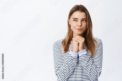 Portrait of thoughtful young woman with blond hair, squinting pensive, having interesting idea, looking left at copy space, standing over white background