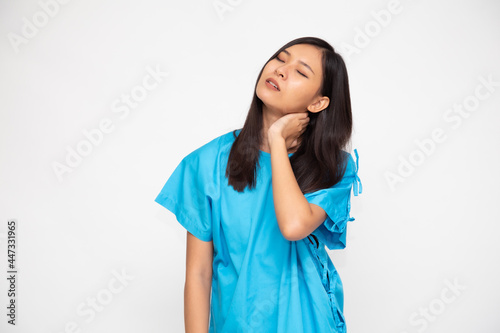 Portrait of tired young Asian woman in blue patient suit with neck pain isolated on white background