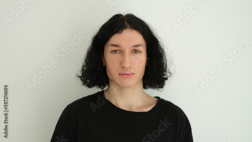 Portrait of transgender man with long hair on white background. Sexual equality concept