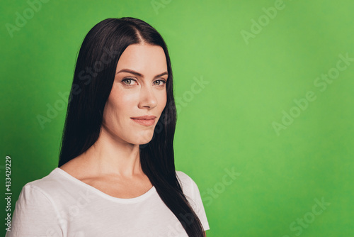 Portrait of trendy girl looking at camera isolated on green background