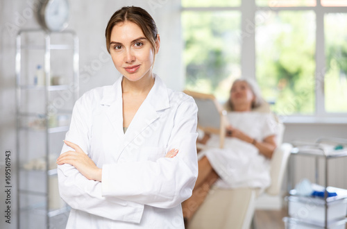 Portrait of trustworthy young doctor in scrub with patient laying in the back.