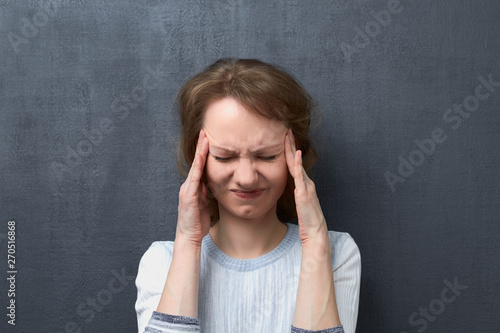 Portrait of unhappy young woman suffering from migraine