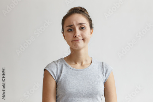 Portrait of upset hopeless young female with blue eyes and hair knot frowning eyebrows and looking at camera with disappointed smile, her look expressing sorrow as if she sas: It is what it is