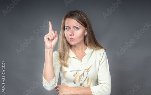 Portrait of woman with attention gesture. She holding finger up, warning listen to me be careful. Close up of girl isolated on grey background. Human emotions, face expression, body language