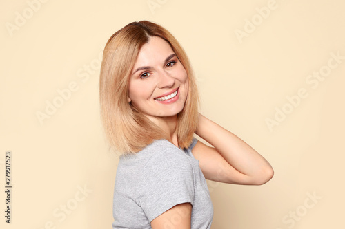 Portrait of woman with beautiful face on beige background