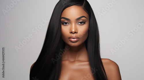Portrait of young african woman with long straight hair. Hair care, make-up and hair health