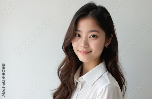 Portrait of young asian woman in white office shirt smiling. Female model, business, happiness, elegant. Beautiful face, long hair on white background. Positive emotions, success, entrepreneur,