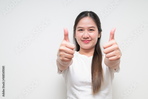 Portrait of young Asian woman smiling and giving thumbs up against white background