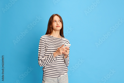 Portrait of young attractive girl in casual clothes, student with thoughtful face typing message on phone over blue studio background. Concept of human emotions, fashion, youth, lifestyle, beauty, ad