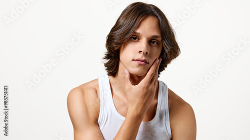 Portrait of young attractive man touching his soft skin on chin after shaving against white studio background. Concept of natural beauty, fashion, cosmetic product, male health. Ad
