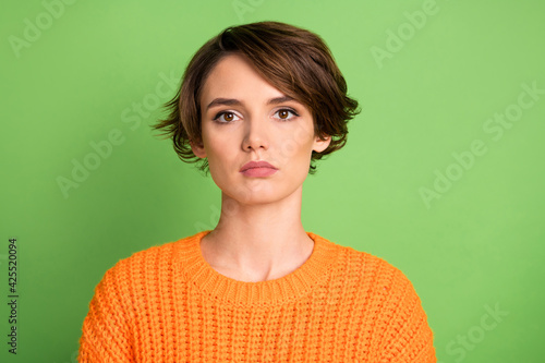 Portrait of young attractive pretty charming serious woman in orange knitted jumper isolated on green color background