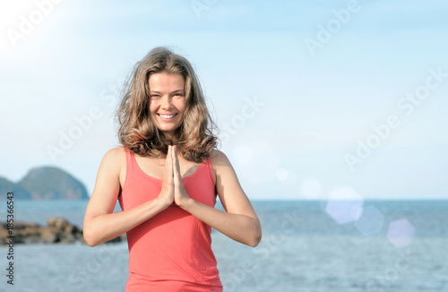 Portrait of young attractive smiling woman practicing yoga on the beach.