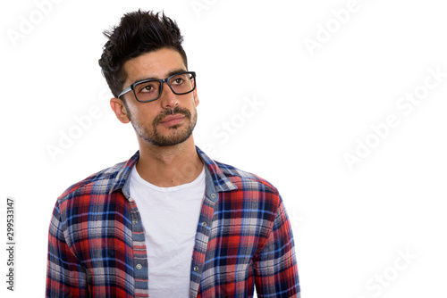 Portrait of young bearded Persian hipster man with eyeglasses