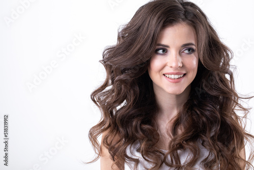 Portrait of young beautiful attractive brunette girl with wavy hair isolated on a white