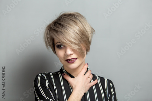Portrait of young beautiful blonde woman with short hair