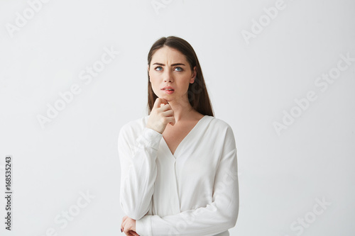 Portrait of young beautiful brunette businesswoman dreaming thinking frowning over white background. Hand on chin.