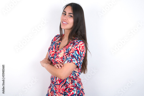 Portrait of young beautiful brunette woman wearing colourful dress over white wall standing with folded arms and smiling