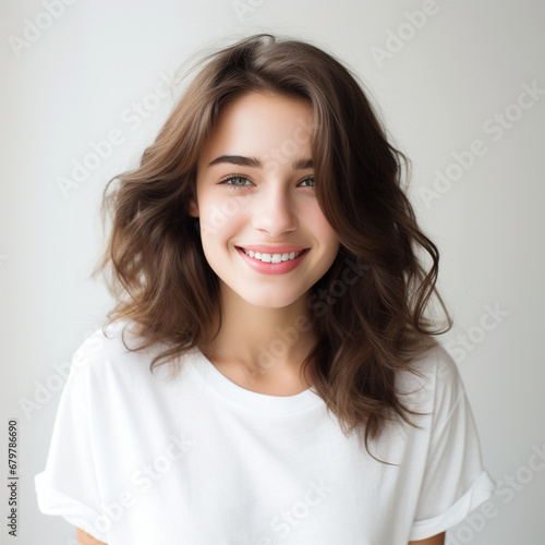 Portrait of young beautiful cute cheerful girl smiling looking at camera over white background, ai technology