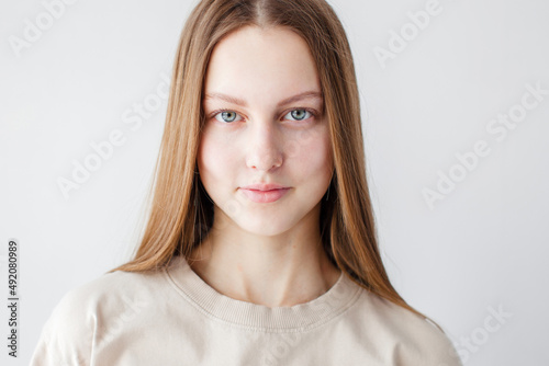 Portrait of young beautiful cute cheerful girl smiling over white background