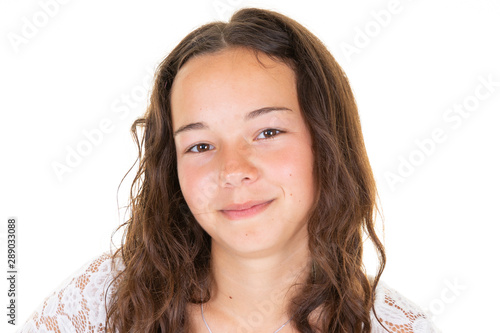 Portrait of young beautiful girl smiling looking at camera over white background