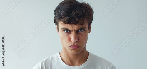 portrait of young beautiful man with angry expression, isolated on red and white backgrounds