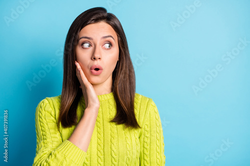 Portrait of young beautiful shocked surprised impressed girl woman look copyspace hand on cheek isolated on blue color background