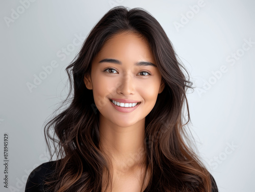 portrait of young beautiful smiling asian indian woman with long hair on white background closeup high detail ultra realistic photo bright lighting studio shot dental ad