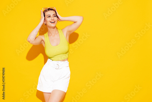 Portrait of young beautiful smiling female in trendy summer shorts clothes. Carefree woman posing near yellow wall in studio. Sexy positive model having fun indoors. Cheerful and happy. Isolated