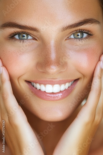 portrait of young beautiful smiling female touching cheeks with fingers as if applying skincare cream