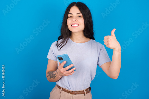 Portrait of young beautiful tattooed girl wearing blue t-shirt standing against blue using and texting with smartphone happy with big smile doing ok sign, thumb up with fingers, excellent sign