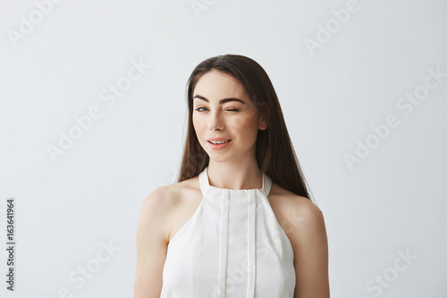Portrait of young beautiful tender girl in blouse looking at camera winking smiling over white background.