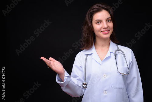 Portrait of young beautiful woman doctor with short hair